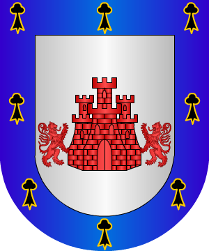 54.- Otros de Castilla: Cortado; 1º, de gules, con dos castillos de plata aclarados de azur, puestos en faja y sumada su torre del homenaje de un estandarte de plata con asta de oro, y 2º, de oro, con dos leones de sable rampantes y afrontados, y en punta tres chevrones de azur.