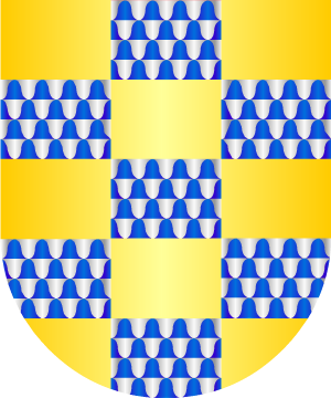 Partido; 1º en sinople, una banda de oro, engolada en cabezas de dragones del mismo metal, y 2º en plata, y terrazado de sinople, un salvaje al natural.