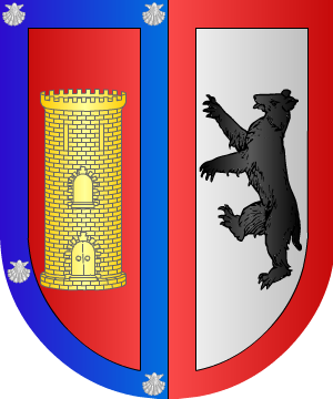 74.- Los de Nevares y Sandedo (Asturias), según Miguel de Salazar, traen: "Acuarteles: 1º, de gules una torre de oro con homenaje y orla azur con cuatro veneras de plata; 2º, de plata un oso de sable empinado y orla gules".