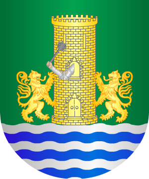 8.- Otros: En campo de azur, una torre de plata, sumada de un guerrero, también de plata, con una espada en la diestra.