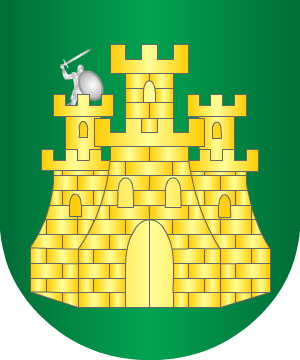 5.- Los de Castilla: Escudo tronchado: 1º, de gules, con una torre de plata, y saliente del homenaje, un brazo armado con una espada; y 2º, también de gules, con tres castillos de plata, puestos en situación de banda y superados de tres flores de lis del mismo metal.