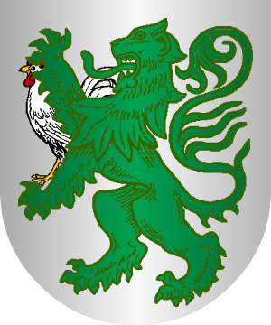 14.- Otros: En campo de plata, un león rampante, de sinople, con un capón en sus manos.