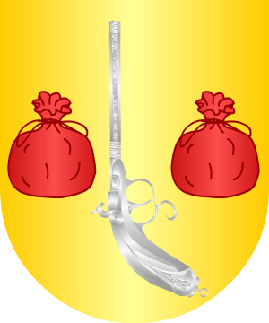 De oro, una faja ondeada de azur. Bordura de gules con ocho aspas de oro.