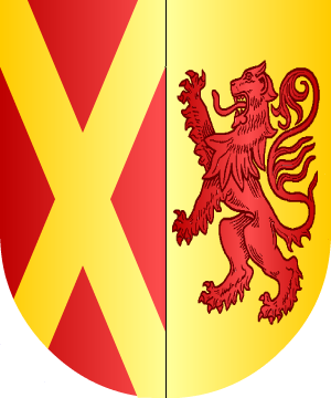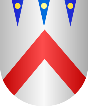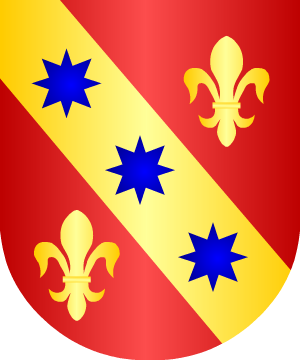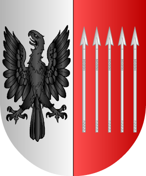 De sinople, una banda de gules, perfilada de oro y engolada de dragantes de sinople, dentados de plata.