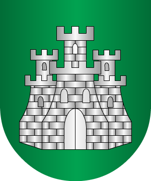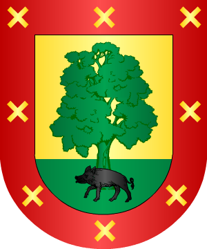 Escudo partido, 1º de plata, un madroño de sinople, frutado de gules; y 2º de azur, una torre de plata.