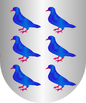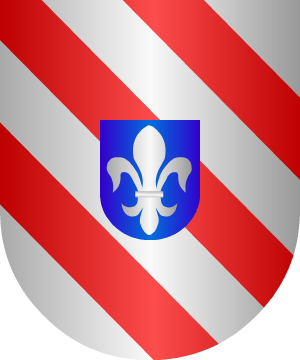 En campo de plata, tres bandas de gules y en el centro del escudo, un escudete de azur cargado con una flor de lis también de plata.