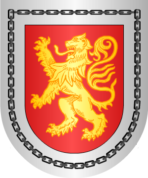 De gules, un lleó d’or; vorada d’argent, una cadena de sable. De gules, un león de oro. Bordura de plata, cadena de sable.
