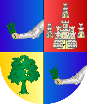 11.- Otros traen: Escudo cuartelado: 1º, en plata, un castillo al natural, con un brazo, de plata saliente de su homenaje, armado de una espada que atraviesa una cabeza, 2º, en gules, una cruz como la de San Juan, de plata, 3º, en azur, un árbol al natural, y al pie de su tronco un león de su color pasante hacia el flanco siniestro del cuartel, y 4º, en sinople, un caballero a pie, junto a su caballo, y como intentando contener con una barra de hierro, colocándosela en la boca, al león que figura en el tercer cuartel.