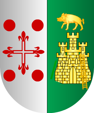 7.- Otros traen: Escudo partido: 1º, de plata, una cruz hueca floreteada, de gules, acompañada de cuatro roeles de lo mismo; y 2º, de sinople, un castillo, de oro, sumado de un jabalí del mismo metal, y una escalera, también de oro, apoyada en el muro del costado izquierdo del castillo.