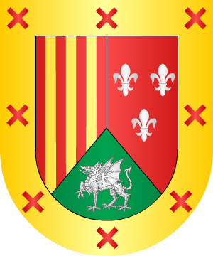 En campo de plata, tres fajas de sable, y bordura jaquelada de oro y gules en dos órdenes; jefe de gules cargado de una cruz de Calatrava de oro.