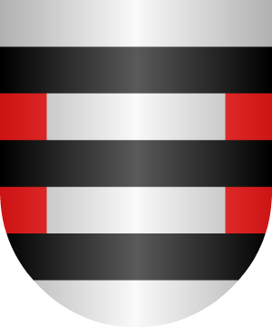 4.- Otros traen: En campo de plata, tres bandas de sable, y bordura jaquelada de oro y gules en dos órdenes.