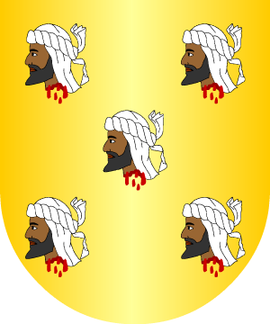 Terán Tarán La casa solar de este linaje (que en antiguos documentos aparece escrita "Therán", forma ésta ha mucho tiempo desaparecida) fue una de las más esclarecidas e infanzonas de la Montaña de Santander. Todos los escritores que de ella tratan sitúan su primitivo solar en el valle de Cabuérniga, pero omitiendo el punto o lugar de ese valle en que sus fundadores lo levantaron. Lo más probable es que fuera en el lugar denominado Terán, del valle de Cabuérniga, y que el nombre de dicho lugar lo tomara por apellido el linaje o que éste le diera el suyo, como era también norma frecuente en antiguos tiempos. Lo comprobado es que la primitiva casa de Terán, ya desaparecida, radicó en el valle de Cabuérniga y que esa opinión es unánime entre los autores que hemos consultado. Solamente el Licenciado Juan Arce de Otálora pudiera desviar de esa general creencia a quien le leyere, por haber escrito lo que sigue: "A cinco leguas de San Vicente, subiendo a Liébana, está la Casa solar de Terán". Datos tan incompletos e imprecisos, que no desmienten los que anteceden. En Castilla y León tuvo casas solares en Frechilla y Marcilla de Campos (Palencia), documentadas en el siglo XVI; en Cataluña en Dosríus (Barcelona), su dueño N. Terán, citada en la Fogueración catalana de 1553, y en Galicia. Juan Enríquez de Terán y Navarra, natural de Carrión de los Condes (Palencia), fue Caballero de la Orden de Alcántara, en la que ingresó en 1633. Probaron su limpieza de sangre para ingresar como religiosos en la Orden de Santiago: Pedro Terán Blanco, natural de Fuentes de Nava (Palencia), del Convento de San Marcos de León, en 1626; y José de Terán Blanco de Salcedo, natural de Fuentes de Nava, del Convento de San Marcos de León, en 1638. Francisco de Terán, natural de Cabezón de la Sal (Cantabria), Prior de Tocina, fue religioso de la Orden de San Juan de Jerusalén, en la que ingresó en 1762. Probaron su nobleza ante la Sala de los Hijosdalgo de la Real Chancillería de Valladolid: Agustín y Pedro Terán, vecinos de Cigales (Valladolid), en 1638; Ambrosio de Terán. vecino de Cameno (Burgos), en 1569; Andrés de Terán, vecino de Aguilar de Campoó (Palencia), en 1662; Diego de Terán, vecino de Amusco (Palencia), en 1590; Francisco Terán, vecino de Pancorbo (Burgos), en 1586; Francisco de Terán, vecino de Salientes. en 1725; Francisco Antonio Terán, vecino de Busto, de la jurisdicción de Santillana, en 1819; García Terán, vecino de Cervera de Pisuerga (Palencia), en 1566; García de Terán, vecino de Cervera de Pisuerga, en 1557; Juan de Terán, vecino de Cotillo, de valle de Anievas (Cantabria), en 1571; Juan de Terán, vecino de Villabrágima (Valladolid), en 1621; Juan de Terán, vecino del valle de Cabuérniga (Cantabria), en 1578; Pedro y Toribio de Terán, vecinos del concejo de Baró (Cantabria), en 1562: Sebastián Terán, vecino de Reinosa (Cantabria), en 1537; Tomé Terán Ceballos, vecino de Aguilar de Campóo, en 1563; Francisco de Terán y Herrán, natural de Fuentes de Nava (Palencia) y vecino de Villamañán (León), en 1549; Antonia de Terán de Molledo, vecina de Segovia, en 1589; Juan de Terán de Molledo, vecino de Palencia, en 1575; y Francisco Antonio Terán y Quevedo, vecino de Puente Pumar, en 1792. Antonio y Crisóstomo Terán, vecinos de Jerez de la Frontera (Cádiz), probaron su nobleza ante la Real Chancillería de Granada en 1618. Armas 1.- Las de la casa del valle de Cabuémiga: En campo de oro, tres bandas de azur. En el cantón siniestro del jefe, una estrella de gules, y otra del mismo olor en el cantón diestro je la punta. Bordura de plata con cinco cabezas de serpiente de sinople, degolladas. Estas armas experimentaron diversas modificaciones, se lo comprueba la forma en que las describen distintos, tratadistas. 2.- Manuel Antonio Brochero, Cronista y Rey de Armas, un real despacho confirmatorio de blasones, expedido en Madrid, el 22 de Enero de 1755, dice que las tres bandas son de gules; la punta del escudo de plata con tres fajas ondeadas de azur, y la bordura, también de plata, con cinco cabezas de reyes moros, al natural, alternando con cinco cabezas de serpiente de sinople degolladas. Otálora las describe así: "Tres bandas de oro de esquina a esquina en campo verde, con dos estrellas que llaman los polos". No obstante los impropios y confusos términos de esta descripción, es evidente que se trata de una variante simplificada de los anteriores blasones, puesto que suprime la bordura, omite algunos esmaltes y varía otros. 3.- En el expediente de pruebas de nobleza del Caballero de Santiago y Sargento Mayor, Pedro Gutiérrez de Mier y Terán, figura el siguiente escudo cuartelado como propio de la Casa de Cabuérniga y descrito así: "Primero, tres barras y dos estrellas en los polos; segundo, un águila y una caldera; tercero, unas ondas, y cuarto, dos leones". Se omiten todos los esmaltes, se llama, indebidamente, barras a las bandas y polos a los cantones siniestro del jefe y diestro de la punta, y se acrecienta el escudo con dos cuarteles, el segundo y el cuarto, que contienen piezas, probablemente de alianzas, que no figuran en otros blasones de Terán. 4.- Los de la casa del lugar de Lombraña, del valle de Polaciones (Cantabria), usaron este otro escudo cuartelado, que encontramos descrito en la siguiente forma: "1º, una cruz llana; 2º, tres flores de lis puestas en triángulo mal ordenadas; 3º, tres barras, y 4º, una torre siniestrada de una flor de lis". En este escudo sólo figuran como piezas propias de las armas de Terán, las contenidas en el tercer cuartel y denominadas equivocadamente barras en vez de bandas. 5.- Los de la casa del lugar de Arenal, del valle de Penagos (Cantabria), traían, según otras descripciones que reproducimos: "Tres fajas; en los polos dos estrellas, y en punta otras tres fajas: orla con cinco cabezas de sierpe". También se omiten todos los esmaltes; se sustituyen con fajas 