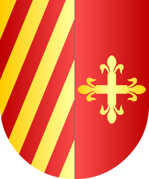 1.- De oro, con una faja azur, acompañada en lo alto, de un lobo andante, de sable, y en lo bajo, de una torre de azur, aclarada de plata. Bordura de plata con ocho flores de lis de gules.