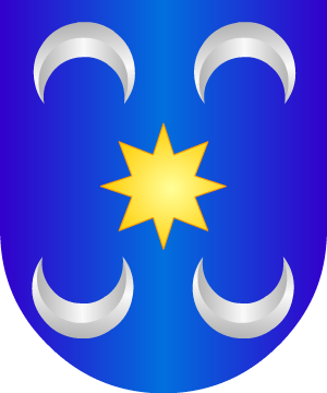 1.- Según los anteriores Cronistas usan: En azur, una estrella de oro, y en cada cantón, una media luna de plata; los de arriba, puntas abajo, y los de abajo, puntas arriba. Bordura de oro.