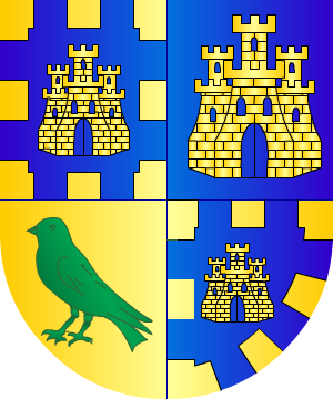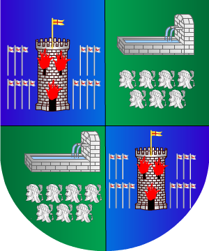 8.- Según Dou: De azur, una villa de oro con tres torres, aclarado de azur; bordura denticulada de ocho piezas de oro.
