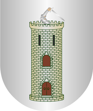 18.- Los apellidados Yebra de Sondica traen: En campo de plata, una torre, de su color, mazonada, de sable, almenada y saliendo de su cima, un brazo armado con una espada, de plata.