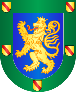 1.- En campo de azur, un león rampante, de oro, coronado de lo mismo. Bordura cosida, de azur, con cinco escudetes de oro, cargado cada uno de una banda de gules.