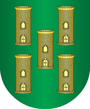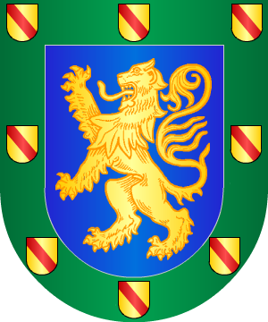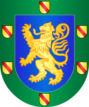 1.- En campo de azur, un león rampante, de oro, coronado de lo mismo. Bordura cosida, de azur, con cinco escudetes de oro, cargado cada uno de una banda de gules.