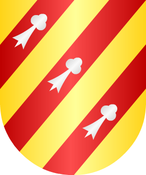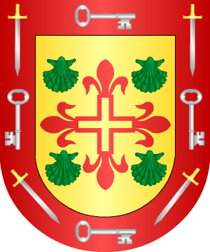 En campo de oro, una torre de piedra, acostada de dos álamos de sinople.