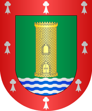 En campo de azur, un león rampante de oro, y en el jefe, tres crecientes