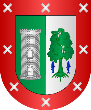 de sinople y dos lobos de sable atravesados al tronco. Bordura cosida, de oro,