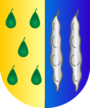 con un jabalí de sable pasante al pie del tronco. Bordura de gules, con