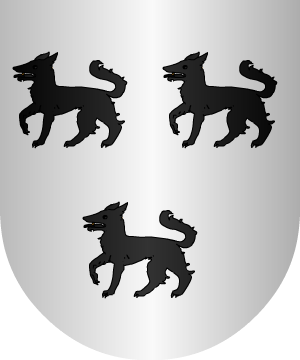 a su lado diestro, un león de gules, y al siniestro, un lobo de sable,
