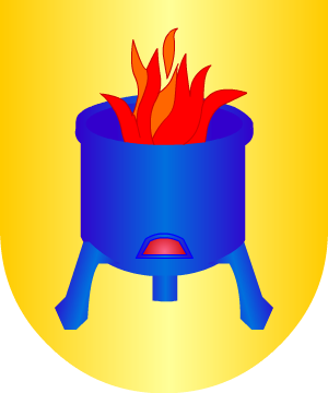 gules, con dos calderas de sable, y, en cada uno de sus cuatro ángulos,