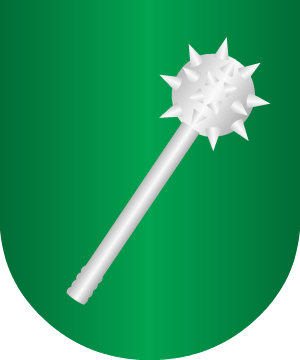 Escudo cortado: 1º, en campo de gules, un grifo, de oro, y 2º, jaquelado