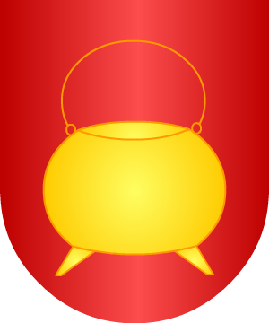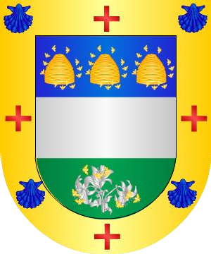 oro y gules, y un león rampante del uno en el otro. Bordura de azur,