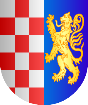 de plata y gules, y 2º, campo de azur, un león rampante de oro.