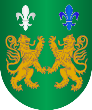 traen: En campo de azur, una flor de lis, de oro, cortado de sinople, con un