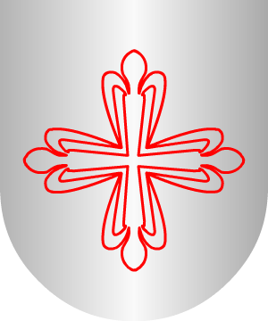 una banda de gules, acompañada en lo alto de una cruz hueca y flordelisada