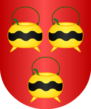 siglo XVI, usando por armas: En campo de gules, tres calderas de oro. 5.- En el expediente del Caballero de San Juan Ramón Calders Meca Armengol y Destorrents, constan las siguientes armas para los originarios de Cervera: En campo de gules, tres calderas de oro con ondas de sable en medio. 6.- Los del Rosellón usan: Tres calderas, la de la punta más grande, y acompañada en el centro del jefe un escudete con tres fajas. 7.- En el expediente del Caballero de San Juan Jerónimo Calders Fivaller Sunyer y Boxadors, constan las siguientes armas: En campo de gules, tres calderos de oro, con una cabeza de sierpe, unas ondas de sable en medio y un asa de sinople. Por cimera un dragón de sinople. 8.- Los radicados en Barcelona, según Vicente de Cadenas, usan: En campo de plata, dos empalizadas de azur, puestas en dos fajas. Información de este linaje complementada por cortesía de blasonari.net |