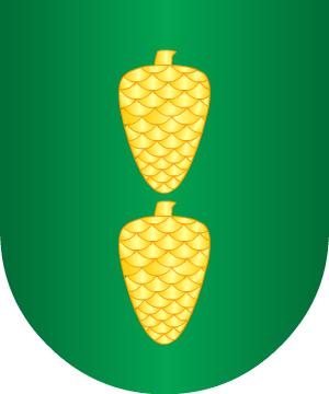 En campo de gules, una cueva de plata, por la que saca medio cuerpo un león