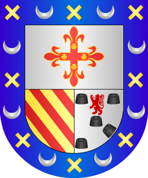 Castellano, de las montañas de Santander. Armas Escudo cortado, 1º de plata, una cruz floreteada de gules, perfilada de oro y cargada con cuatro veneras de oro; y 2º partido, en el primero de oro, tres bandas de gules, y en el segundo de plata, cinco quintales o pesas de sable, puestas en aspa, y la del centro surmontada de un león rampante de gules armado de oro. Bordura general de azur con ocho crecientes de plata, interpolados con ocho aspas de oro. |