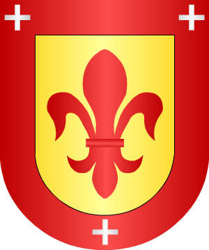 De oro, una flor de lis, de gules. Bordura de gules con tres cruces llanas de plata.