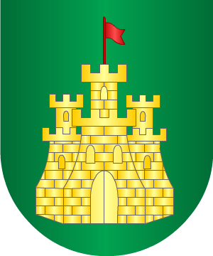 En campo de oro, una torre de azur surmontada de una "M" de sable.