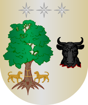1, 3 y 1, cargados cada uno de cinco bezantes, de plata; bordura de gules, con