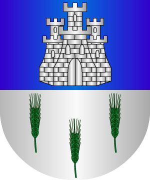 de dos flores de lis de oro, puestos en faja. Bordura de azur, con ocho castillos