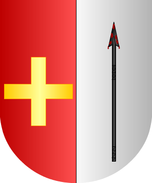 de sinople, sumada de una sierra de carpintero de oro, surmontada a su vez,