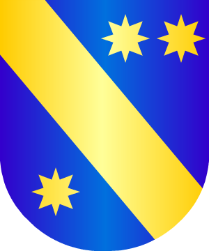 de azur, una banda de oro, acompañada de dos estrellas del mismo metal,