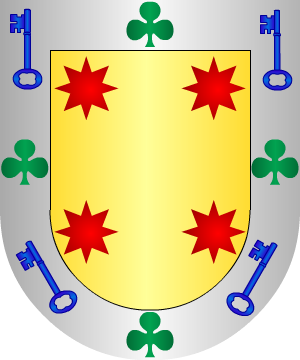 2.- La rama de Galicia acrecentó ese escudo con cuatro llaves de azur puestas entre las cuatro estrellas de los ángulos. 3.- En la casa que en la ciudad de Pontevedra mandaron reedificar en la plaza de Teucro, los Tavares-Montenegro, que mandaron reedificar Antonio Félix Tavares y Mariana Montenegro, en una piedra armera, aparecen: Cuatro estrellas, una en cada cantón. En la bordura, cuatro llaves con cuatro tréboles también en los cantones de la bordura. 4.- Los de junto a Santiago de Compostela traen: En campo de oro, una estrella de gules en forma de cruz. Así constan en varios escudos del Pazo de Castrelos. 5.- Otros: En campo de oro, cuatro estrellas de gules, una en cada cantón. Bordura de plata con cuatro llaves de azur entreveradas con cuatro tréboles de sinople situadas en los ángulos de dicha bordura. 6.- Otros: En campo de oro, cinco estrellas de gules, puestas en sotuer. Bordura de plata con cuatro tréboles de sinople entreveradas con llaves de azur situadas en los ángulos de dicha bordura. 7.- Los radicados en Porriño (Pontevedra), según Vicente de Cadenas, usan: En oro, dos leones, de gules, afrontados y sosteniendo una espada, con una bandera en su punta. 8.- En la casa de los Marqueses de Salvatierra, de Ronda (Málaga), constan en una piedra armera: Un sotuer a todo trance, cargado de cinco bezantes. 9.- Los originarios de Túnez, radicados en Madrid, según Vicente de Cadenas, usan: En campo de plata, tres peras, de sinople, mal ordenadas. Información de estos linajes por cortesía de blasonari.net |