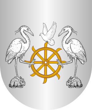 usan: Escudo partido: 1º, en campo de sinople, una rueda de molino de plata,